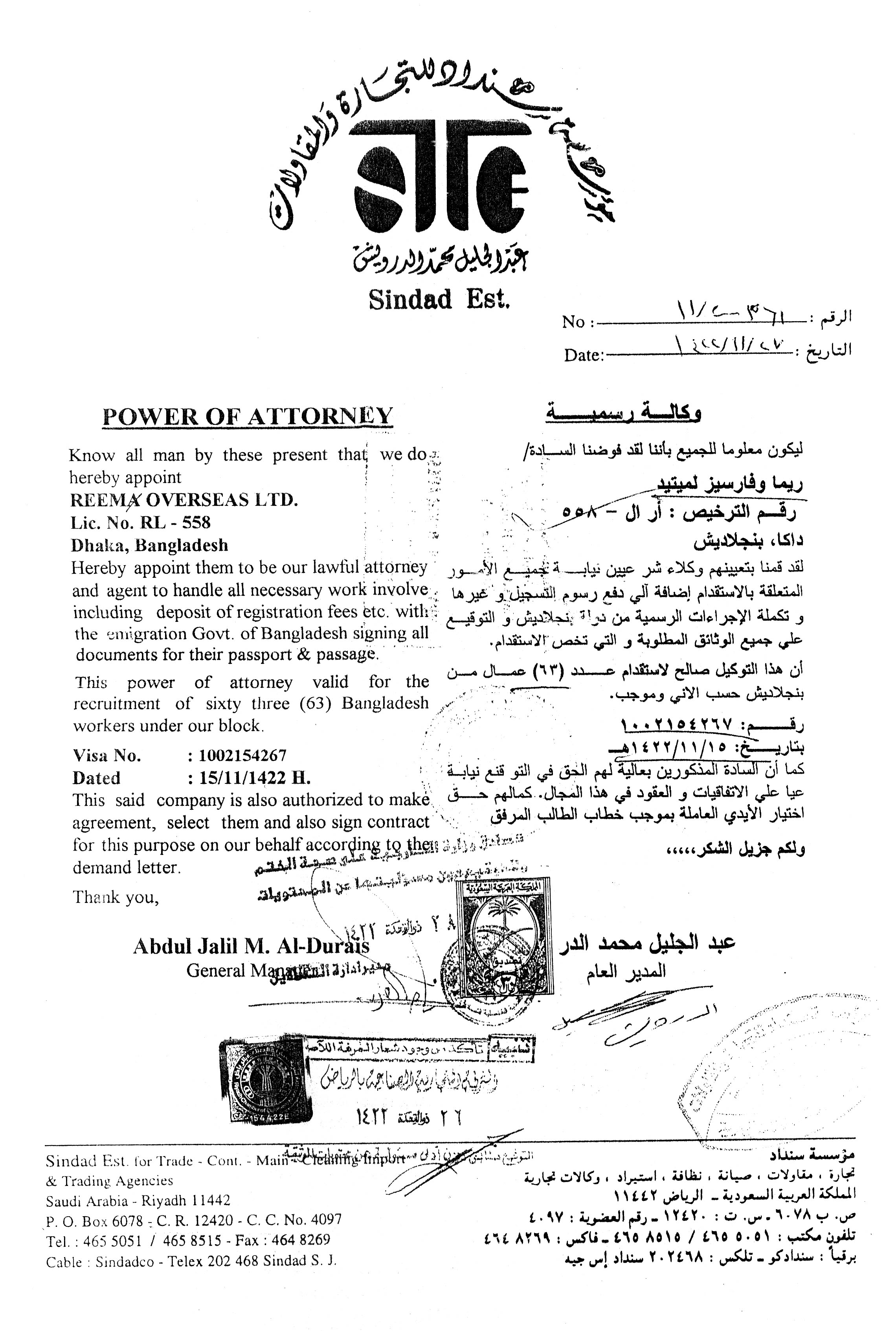 The client needs to provide Reem Overseas Limited with a Power of Attorney duly authorising us to handle all formalities regarding preparing visa applications and obtaining visas from the respective Embassy on behalf of the employer. The Power of Attorney must be attested by the Embassy of Bangladesh existing in the country of employment and endorsed by its Chamber of Commerce and industry and the Ministry of Foreign Affairs.