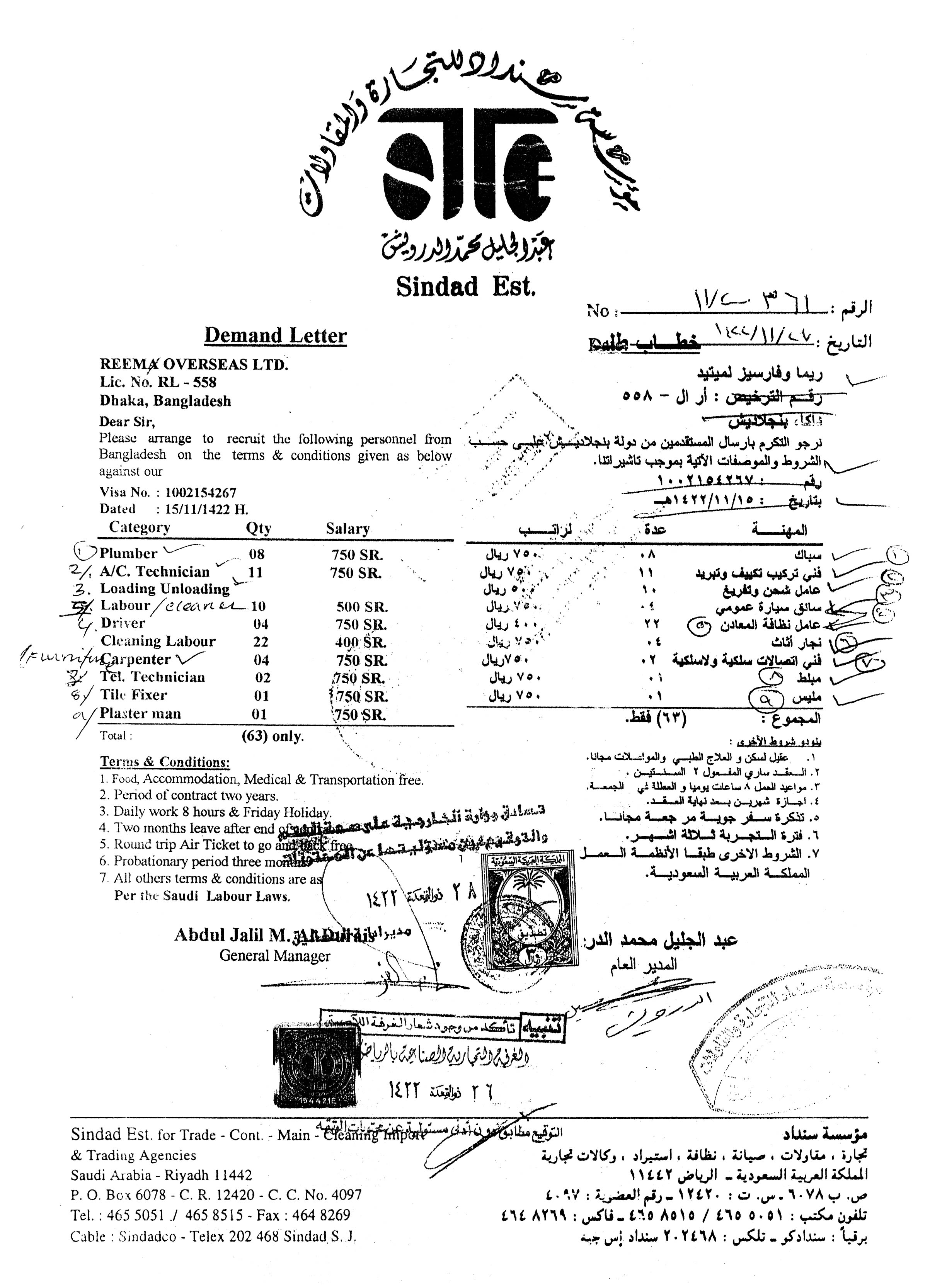 A Demand Letter with complete statement of job categories, number of workers required category-wise, worker's monthly salary, period of contract and other benefits offered to the candidates such as Food, Accommodation, Medical Treatments, Vacations and Air tickets etc. is needed to complete the paperwork formalities.